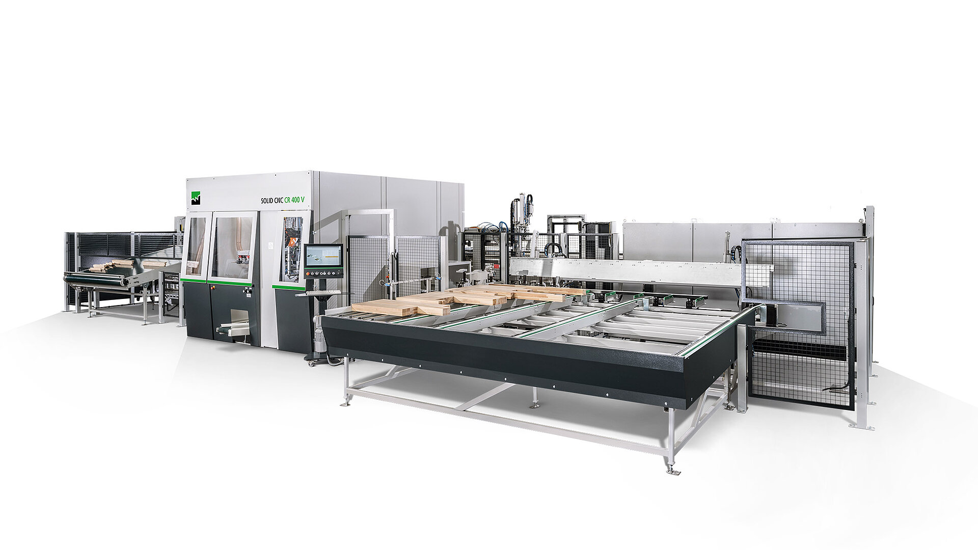 Der Produktionsprozess beginnt mit dem Zuschnitt der Rohmaterialien durch die SOLID CUT PF 900 direkt am Lager, gefolgt von einer Weiterverarbeitung auf dem SOLID PROFILE P 700 WI, wo die Teile präzise gehobelt werden. Über einen Querförderer gelangen die Bauteile zur Schleifmaschine SOLID FINISH RF 200, wo je nach Holzart und Lackierung die Oberfläche mit Bandschliff oder Roto-Finish bearbeitet wird. Nach dem Schleifen sorgt die voll integrierte SOLIC CNC CR 400 V für das Profilieren der Bauteile, die anschließend zur weiteren Verarbeitung auf die SOLID PIN PVAc übergehen, wo Dübelarbeiten und Verleimungen automatisiert stattfinden.